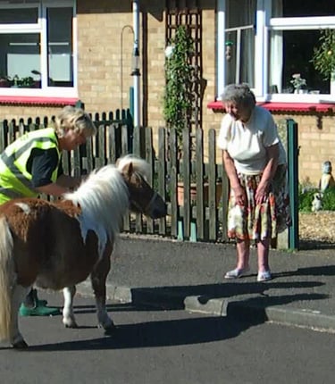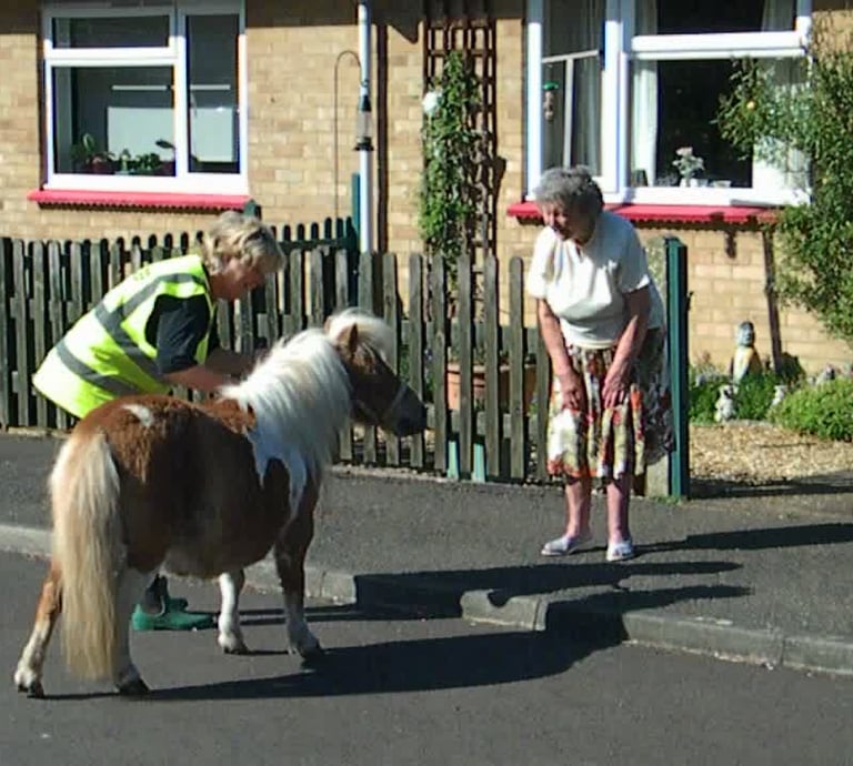 During the Covid-19 lockdown Mini Milton the rescued pony went out to visit and cheer up the elderly residents in her community . Mini Milton was the only survivor when herself and eleven other ponies ended up on the railway line . Sadly her friends did not survive . Mini Milton ran off and went into hiding only to return six weeks later. She was rescued by the Shetland Pony Welfare Trust who have trained her as a therapy pony . She regularly visits the elderly in the village where she lives . In 2020 she undertook lockdown visits bringing a smile to lots of local residents at a time when many were feeling very isolated and lonely . A little pony who touches the hearts of so many people .